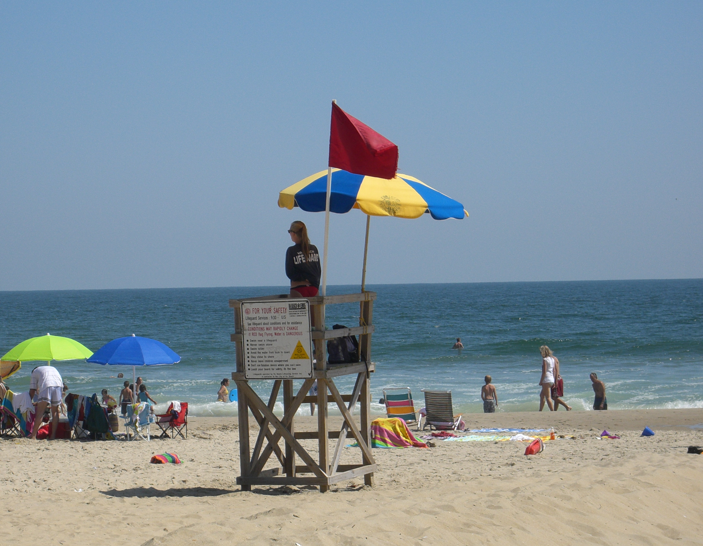 The morning was radiant with sunshine on white sand, rays blazed through cloudless sky, and curling waves spewed surfers onto shore. Beach umbrellas dotted the waterfront and our freckled bodies glistened with SPF 50. Families were soaking in the last sounds of summer, ours among them. Saturday we took advantage of a picture-perfect day to go to the beach. The waves were stronger than usual due to the lingering influence of Danielle and the pull of the full moon, making excellent conditions for the weekend’s ECSC event (East Coast Surfing Championships). Nothing about that day to cause anyone to suspect that danger was lurking just a short distance from shore—nothing except the red flags waving from every lifeguard’s chair. The red flags indicated that strong rip currents were present, currents just below the surface of the water, ready to carry even the most experienced swimmer out to sea. When the red flags are flying, beach-goers are supposed to stay out of the water or at least go no farther in than to their ankles or knees. But many swimmers chose to ignore the warning whistles, putting themselves and the lifeguards in danger. This past weekend the Virginia Beach lifeguards made 148 rescues.
