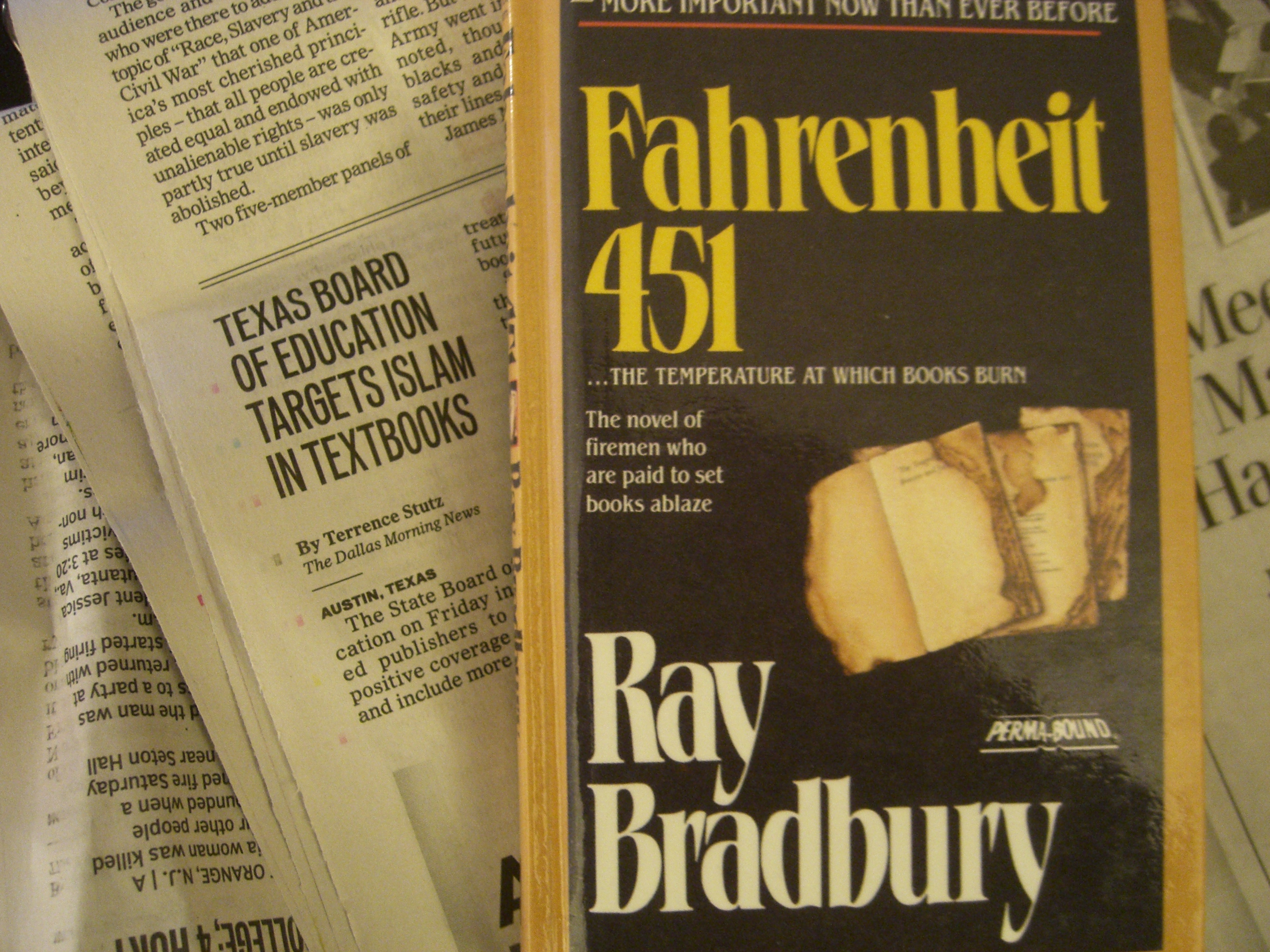That article on the textbooks really bothers me because it doesn’t mention anything about what the truth is but what the social conservatives want.  They are shaping the knowledge base of the young people in Texas.  They don’t have to include anything that is false in those textbooks, but by leaving out other “truths,” the students will get a very skewed view of the world, and that is exactly what that majority wants.  As Bradbury writes in the Coda of his novel,  “There is more than one way to burn a book. And the world is full of people running about with lit matches.”