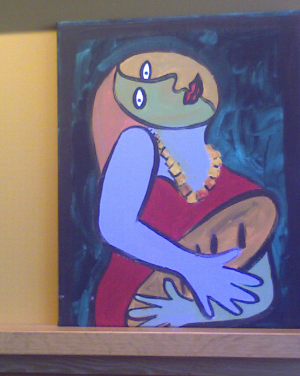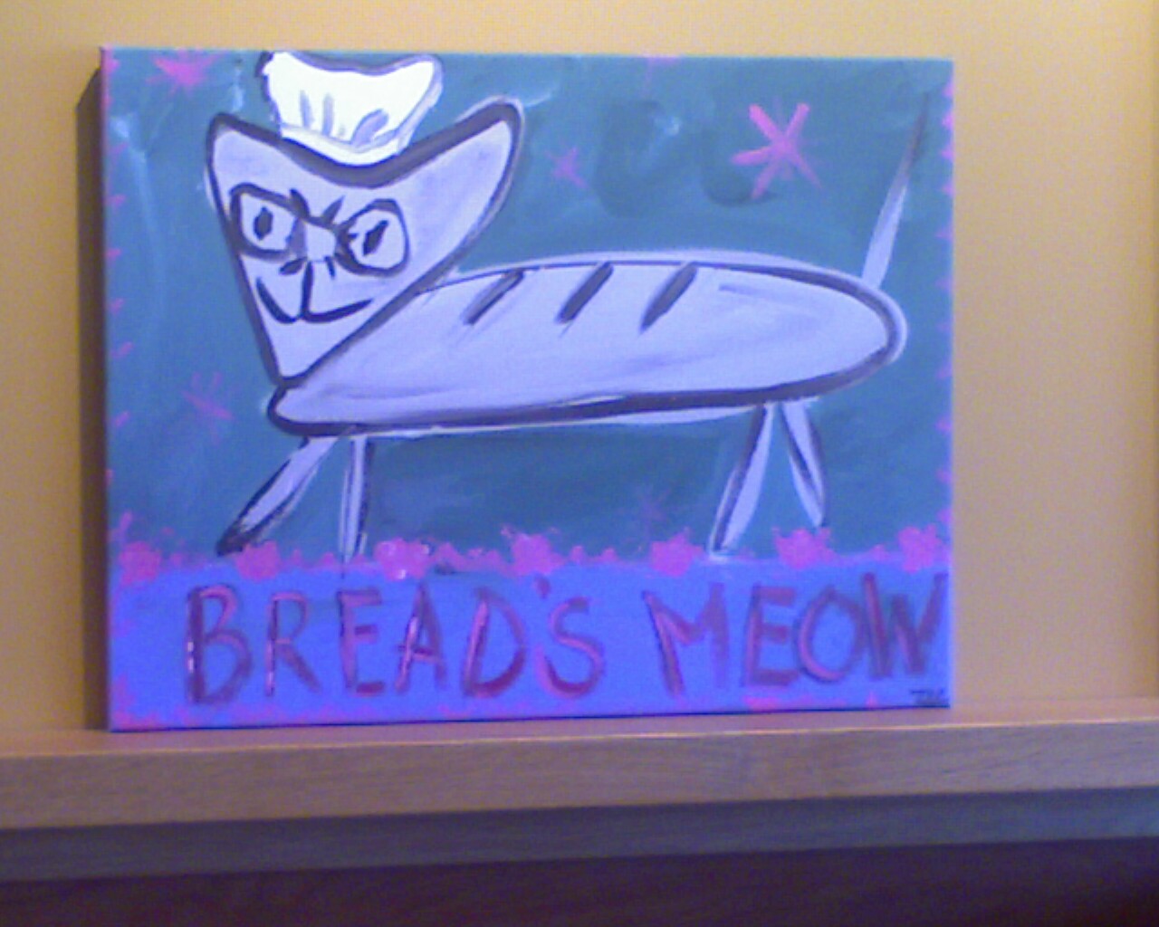 Bread is the problem, so why am I sitting here at Panera‘s?  As if it weren’t enough to be accosted by rows of bagels, loaves of bread, and a variety of pastries as soon as I walk in the door, I’m confronted by four walls adorned with whimsical pictures where bread is the main feature.  I see a cat whose body is a loaf of ciabatta.  I’m staring at a Picasso-like painting of a woman holding a loaf of Italian bread.  Actually, the way she’s lovingly holding the loaf in her arms, one end nestled against her breast, it looks like she’s nursing it.  That is true devotion.