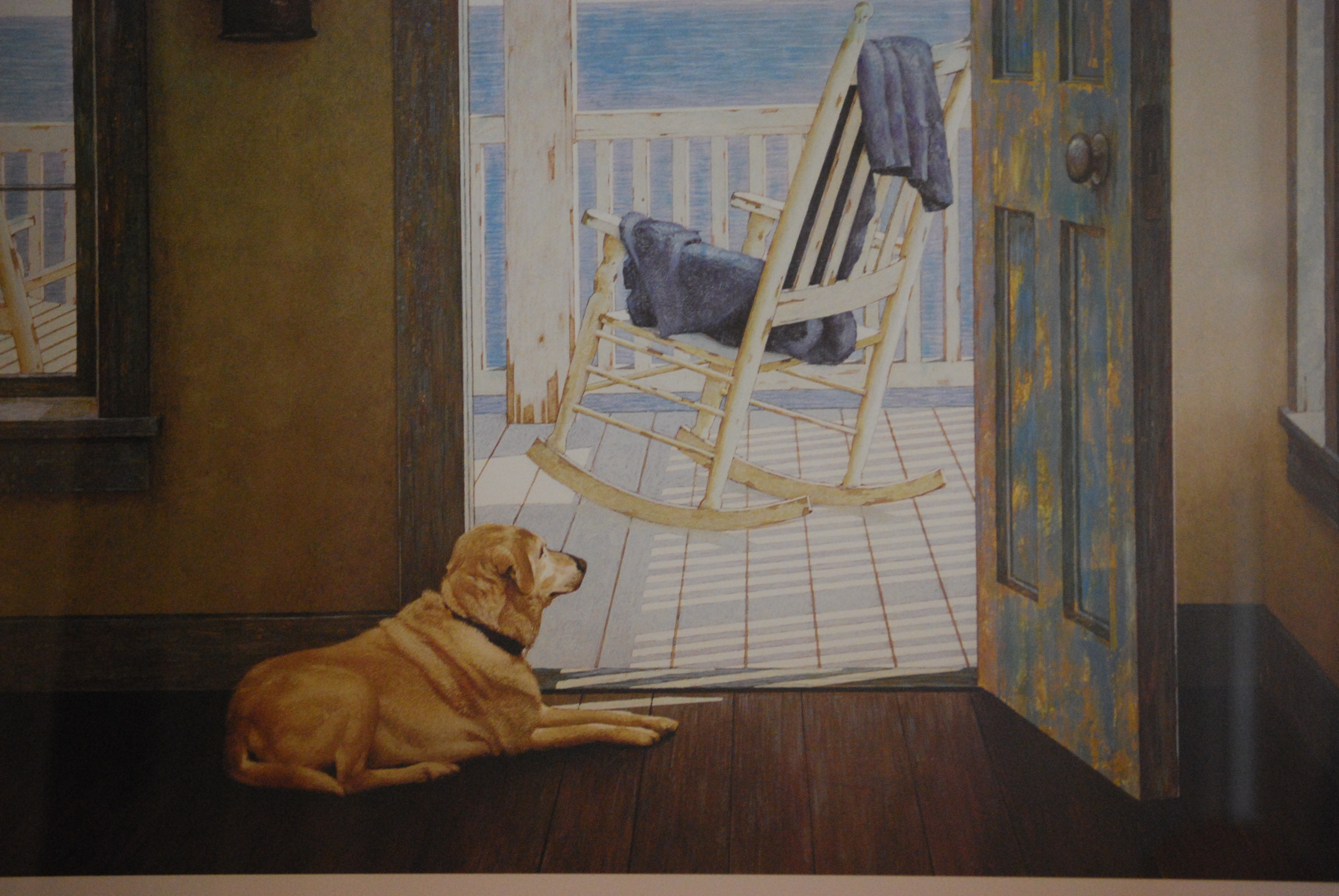 I’ve seen similar prints, but what made this one so special was the yellow Lab who was sitting just inside the door, looking out. It was my Abby Dog, (see Don’t Tell Me Dogs Don’t Have Souls) the way she looked when she was older, when the kids had grown up and moved out and there was just my dear husband and I left at home. I stared at that picture and created a whole scenario for it: My husband and I were in the house, making some lunch to bring out to the porch, and Abby Dog, not wanting to go outside without us, was waiting for us to come and sit on the porch with her. Then she would sit between us, perhaps putting her head on our laps to catch an occasional crumb that might fall. We would sit outside, enjoying the sea breeze, and spend a quiet Saturday afternoon with her.