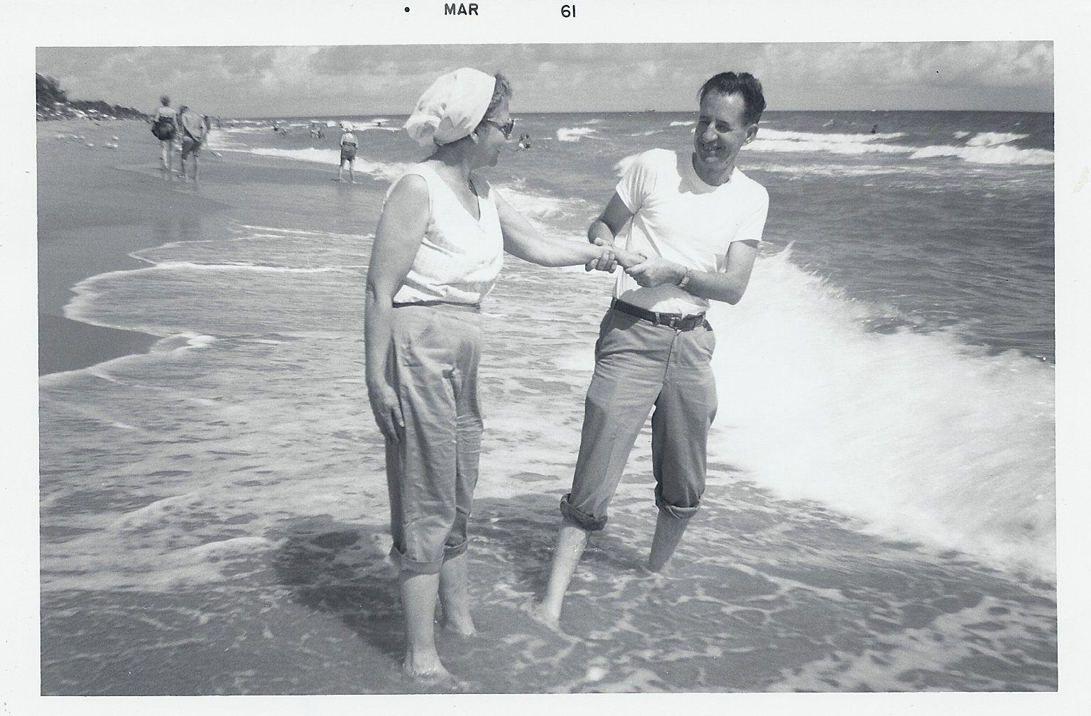 Here is a picture of my grandmother, my mother’s mother.   When was it taken?  How old was she?  Was she married to Daddy Bill yet?  Had she given much thought to what shape her life might take?  And what about the picture of my grandfather trying to pull my grandmother into the ocean?  At least there is the imprint of the date on the front of the picture, so I know my grandfather was only a year younger than I am now.  I can surmise they were in Florida at the time, since I know they used to leave their cold Ohio home in the winter to spend time in Clearwater.  I love the playful look on my grandfather’s face, and I love seeing how vibrantly alive and healthy he looked because his health deteriorated not so many years after that.  And Grandma?  I can’t see her face, but was she smiling at Daddy Bill’s antics?  Did she give any thought to that time so many years ago when the earlier picture was taken and think, Yes, this has been a good life.  This is what I had hoped for.