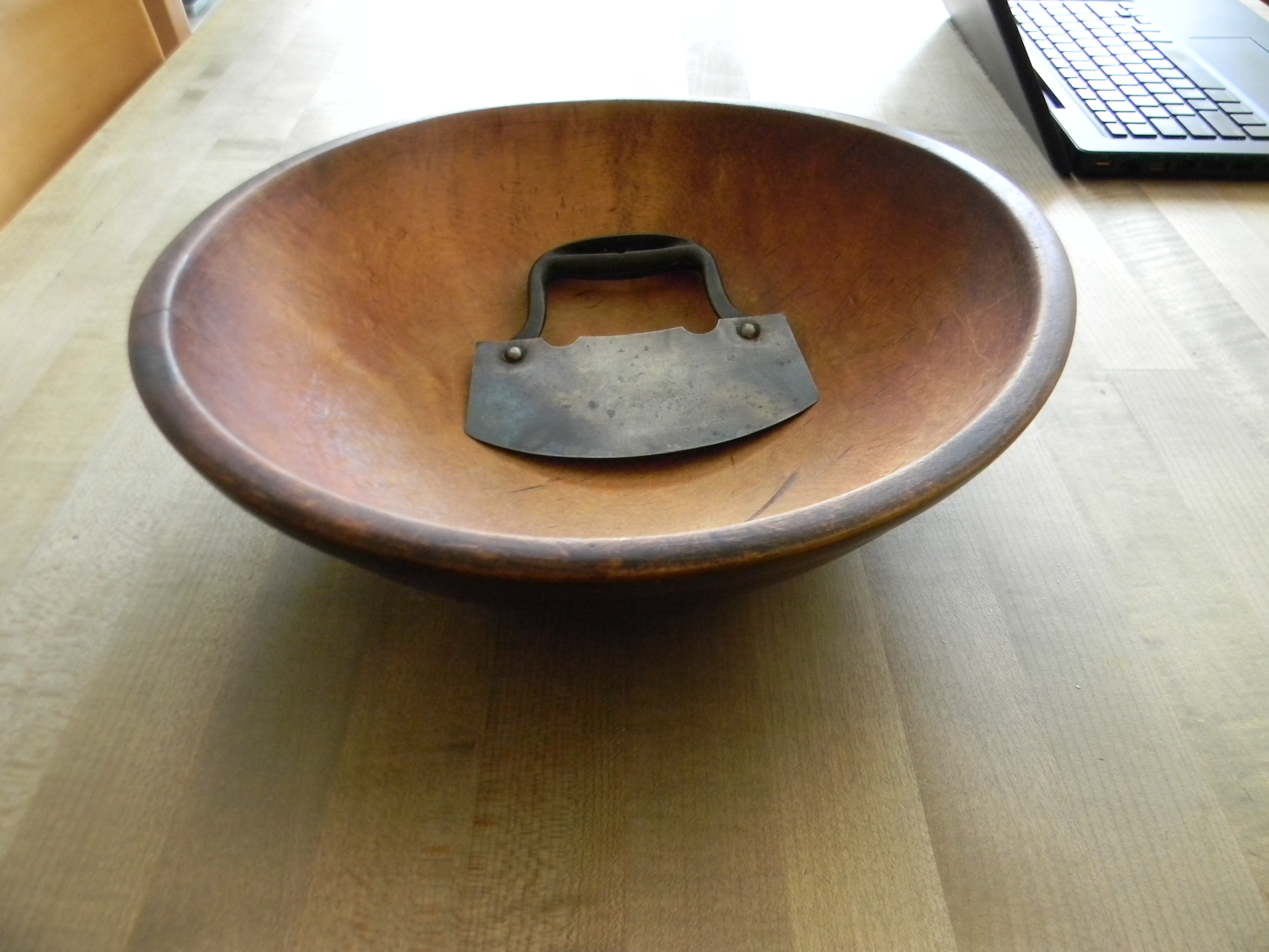 Third, my grandmother’s liver bowl and chopping blade.   She made the best chopped  chicken liver and taught me how to make it.  This is the bowl and blade she made it with, and I claimed it when she died.  After all, I am the only one left who knows the recipe.  Unfortunately, now that we know about such things as high cholesterol, liver is a no-no, and schmaltz (rendered chicken fat) is definitely taboo.  I haven’t used this bowl for many years now.  What I wouldn’t give for a chopped chicken liver sandwich on rye with a big slice of red onion.  Anyway, the bowl and blade are ancient, so what do you think I could get at auction for them?  The liver smell is completely gone.  I swear.