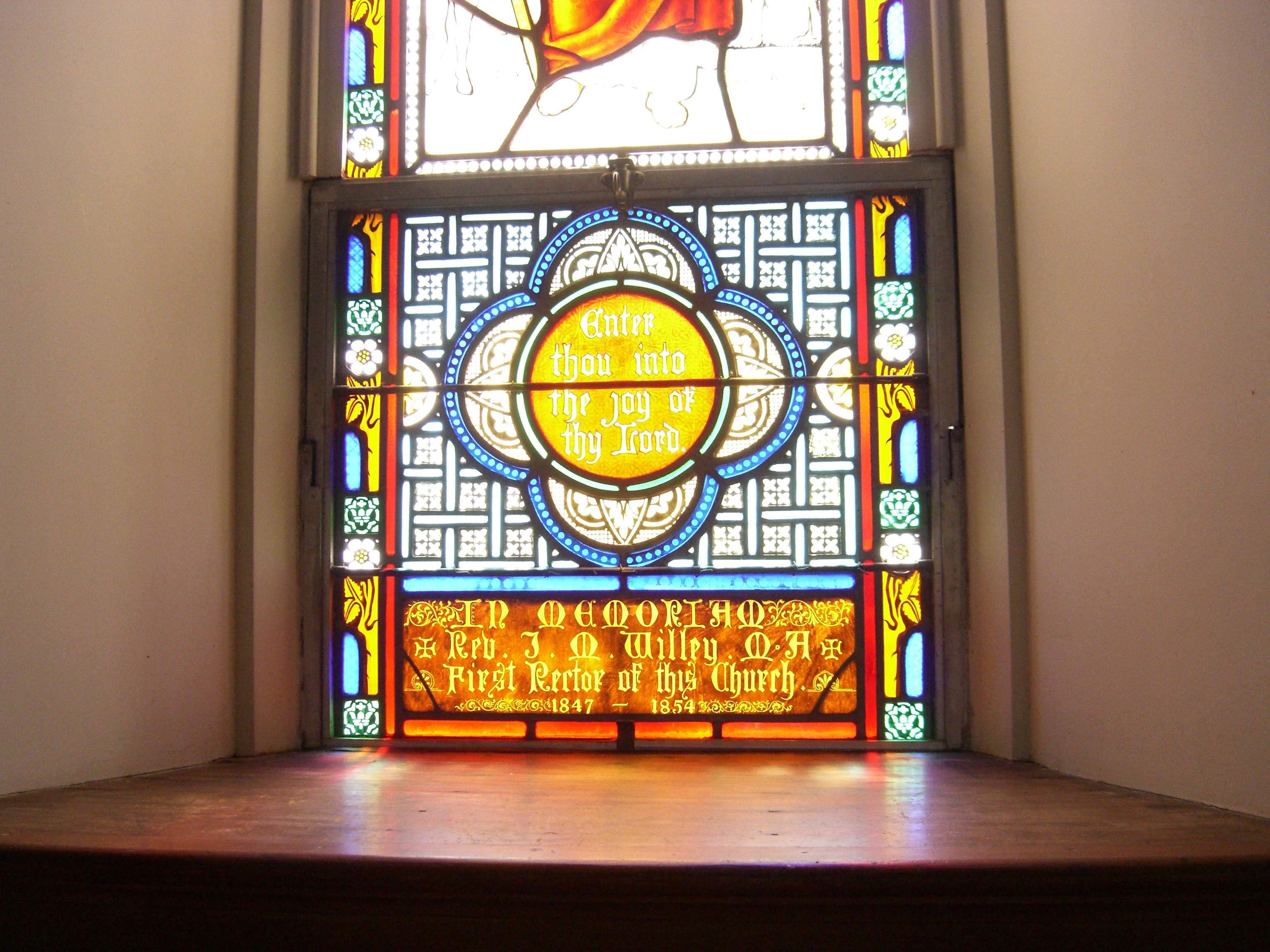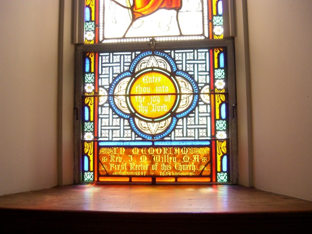 Sun shining through stained glass window of little Episcopal church in Stonington, Connecticut