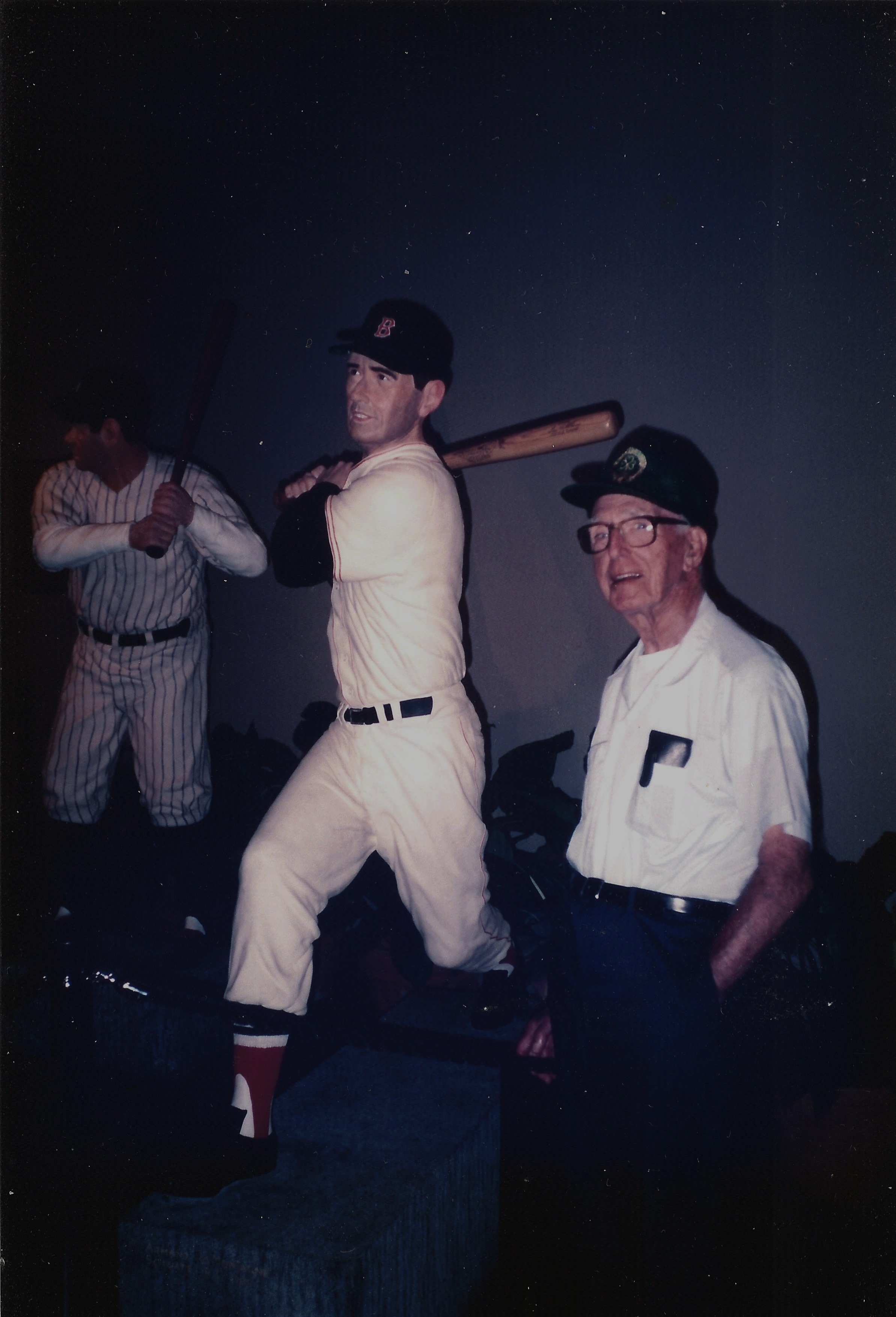 Ted Williams and Dad 001I don’t remember him being very impressed and, although he followed the season, he always seemed to be disappointed. Consequently, I was left with unanswered questions and never developed much of an interest in baseball. I was pleasantly surprised, however, when we entered the baseball museum and we came face to face with the wax figure of Ted Williams, someone even I remembered from Fenway as a hero on and off the field. We took a picture of Dad and Ted; Ted was the one swinging the bat.