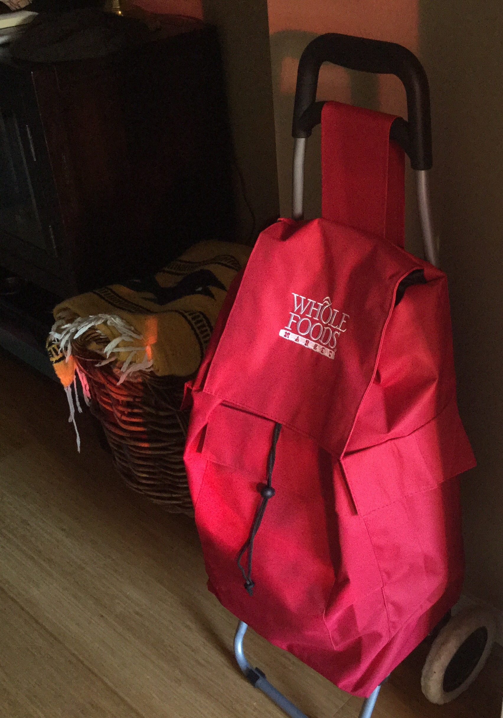 After I got my groceries, I slowed my pace so I could look in some of the store windows on my way home.  In one window I glanced up and saw reflected in the glass an old woman.  She had a little red Whole Foods cart just like mine.  How wonderful!  It’s catching on!