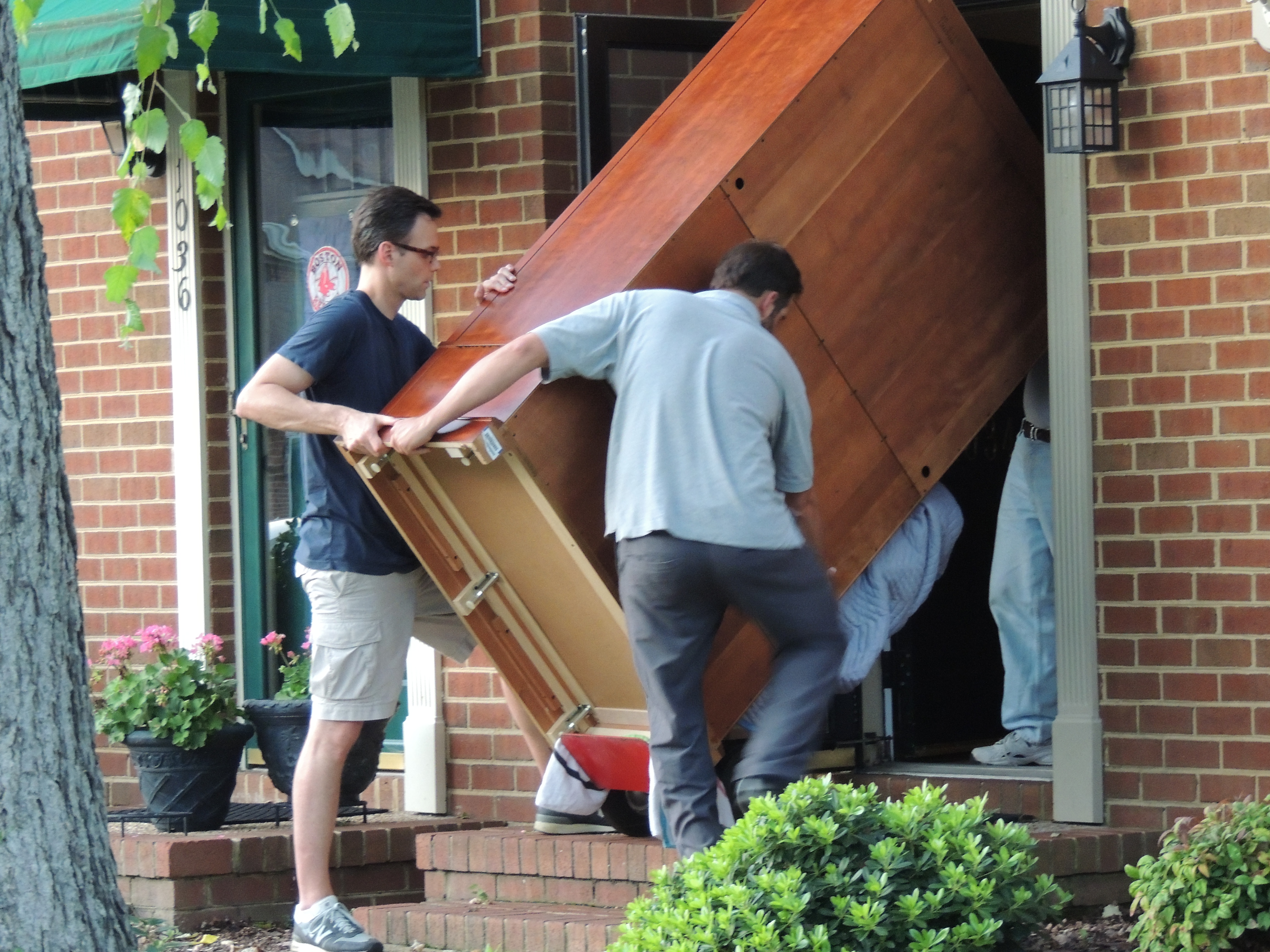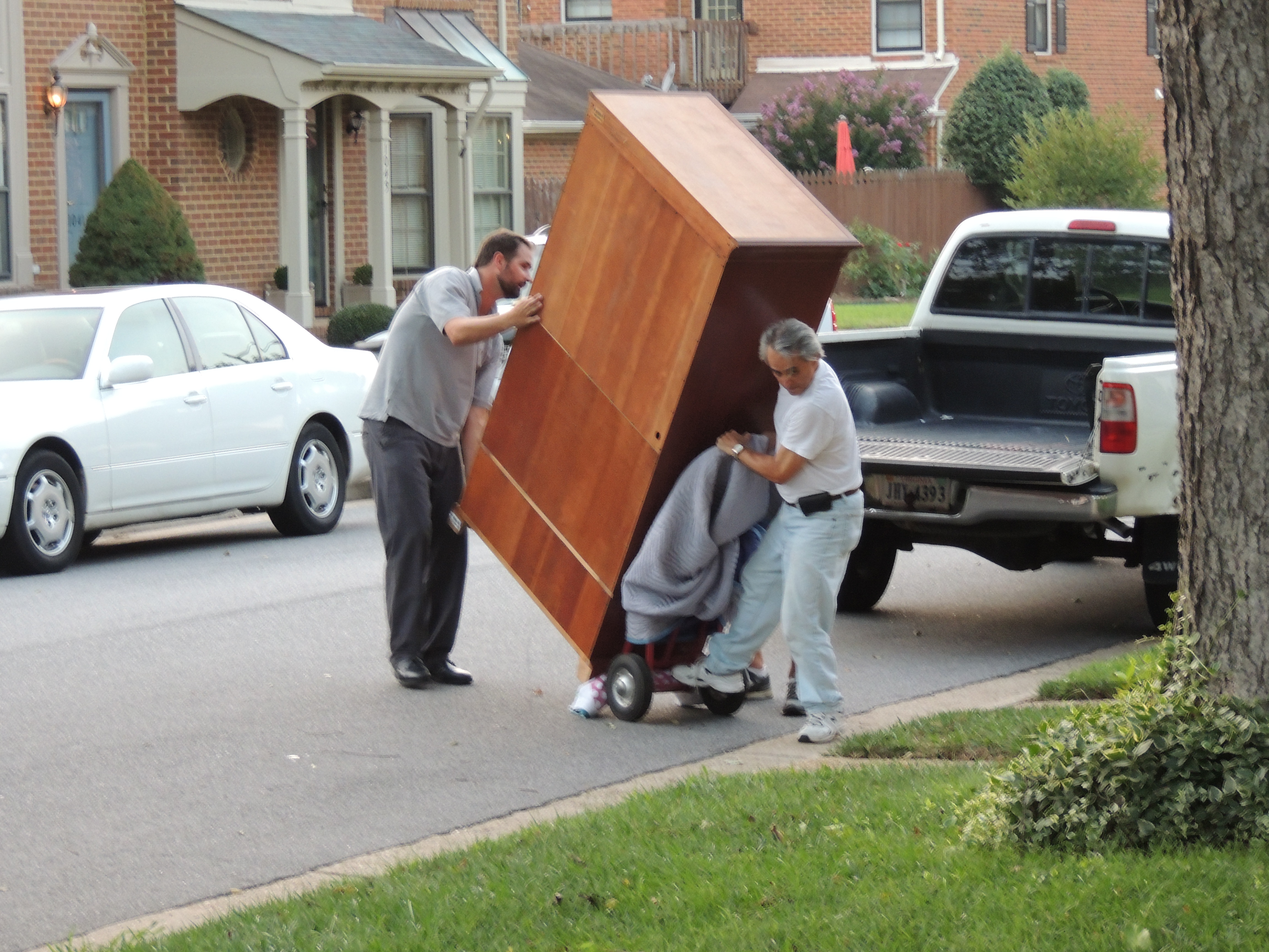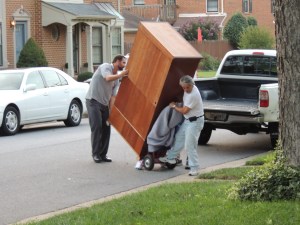The young men were pleased with the blanket but skeptical of the handtruck, thinking it was too small to be of any use. Once they got the wardrobe off the truck, though, and were able to get it over the curb with the handtruck, one young man said, “This is going to work!” My husband just smiled.
