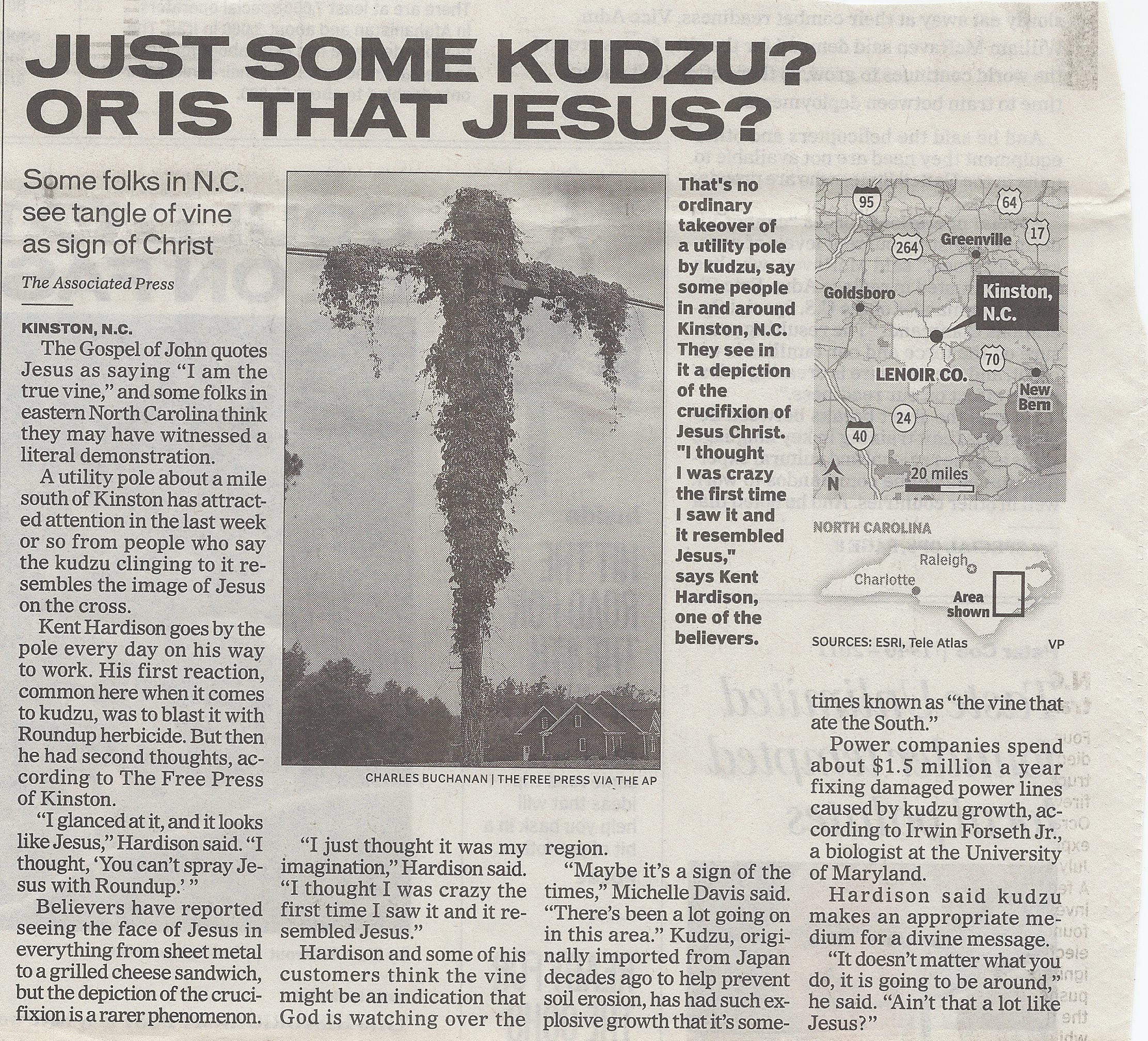 Not long ago, I read an article in the paper about a kudzu vine that had transformed a utility pole into a vision of Jesus on the cross.